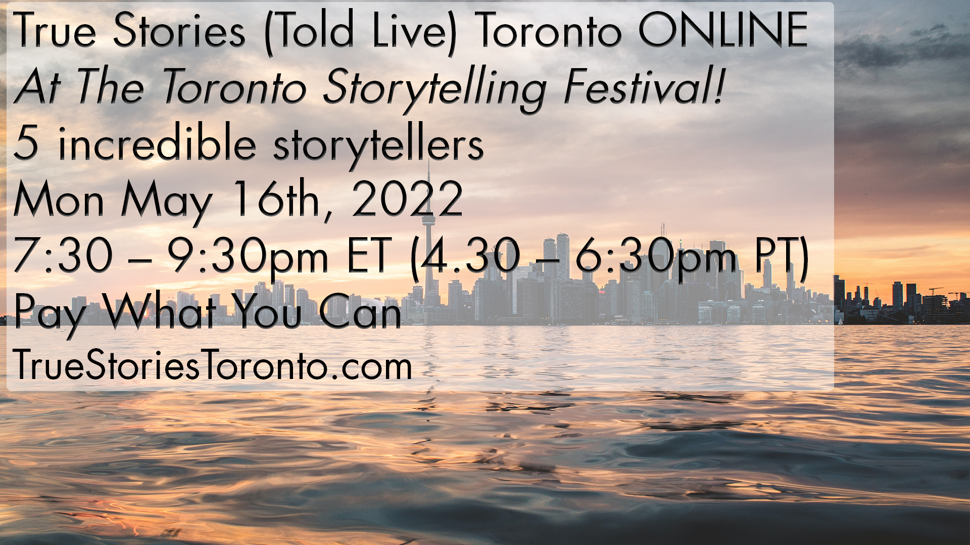 For more info, or to join our very infrequent mailing list, go to: http://www.TrueStoriesToronto.com
